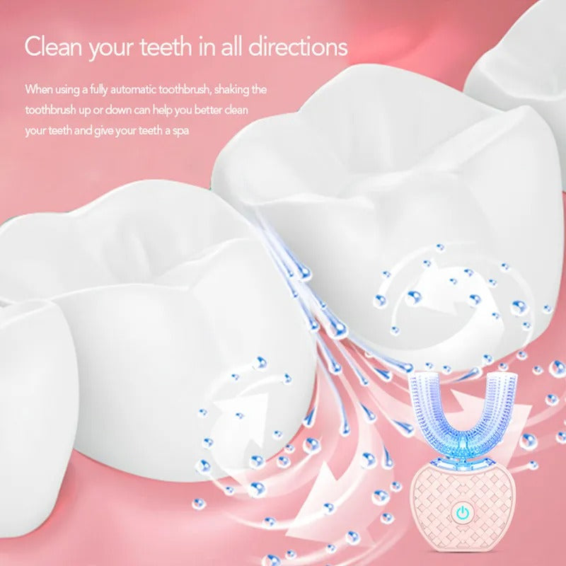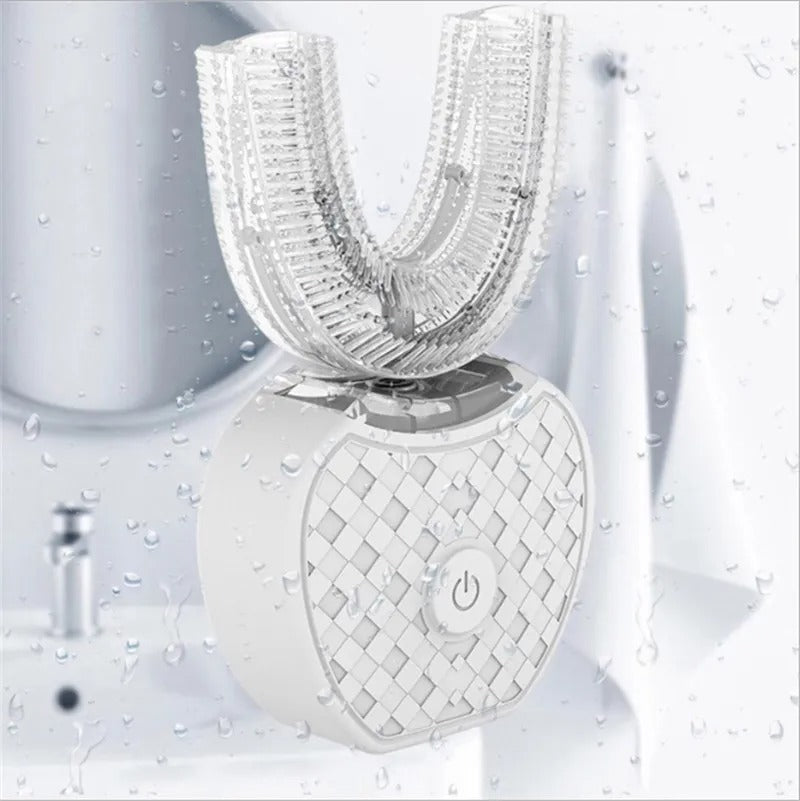Designed to provide consistent cleaning in less time, this hands-free toothbrush features a U-shaped brush head that aims to reach multiple angles simultaneously. It uses vibration-based technology for daily oral maintenance and includes a built-in blue light.