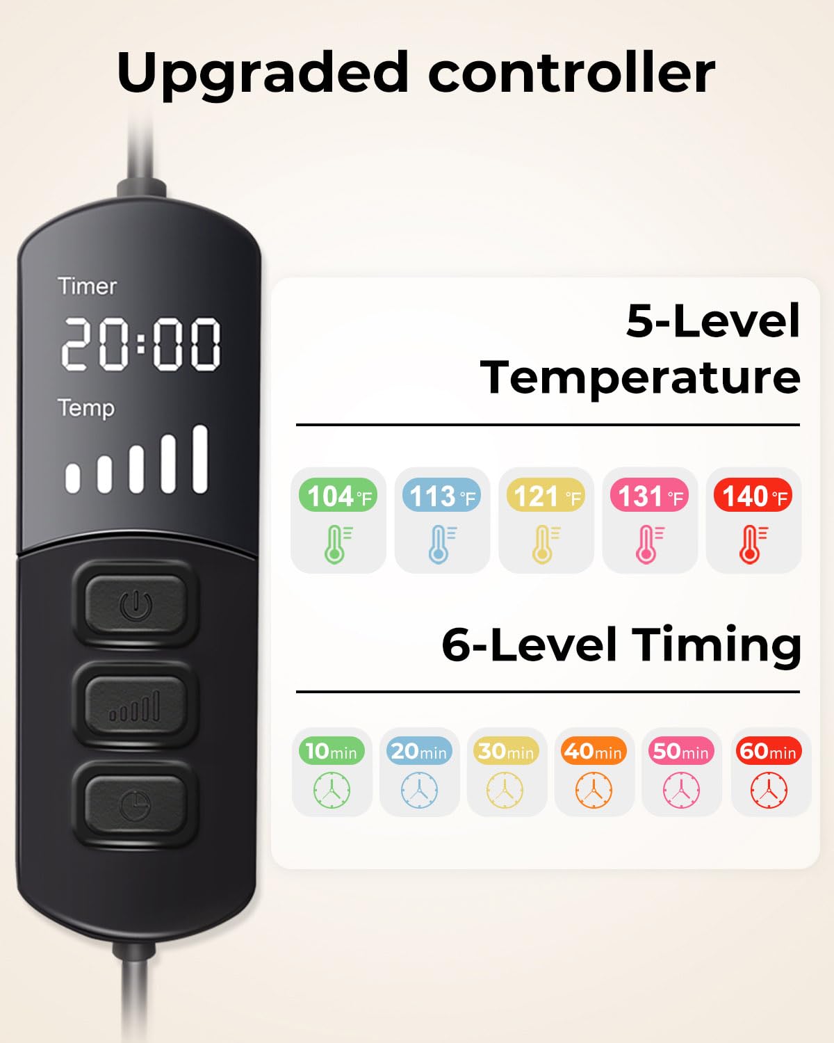 CUSTOMIZABLE HEAT AND TIMING: Five heat levels (104℉ to 140℉) and six timing options (10 to 60 minutes) for personalized comfort.
