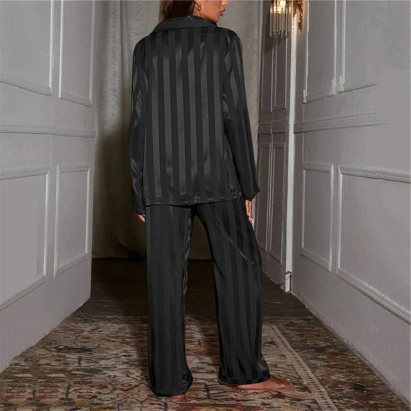 This two-piece pajama set is designed for consistent comfort during rest and leisure. The top features a button-down front for adjustable coverage and ease of wear, while the trousers are fitted with an elastic waistband to ensure a flexible and secure fit. The lightweight construction allows for year-round use in indoor environments.