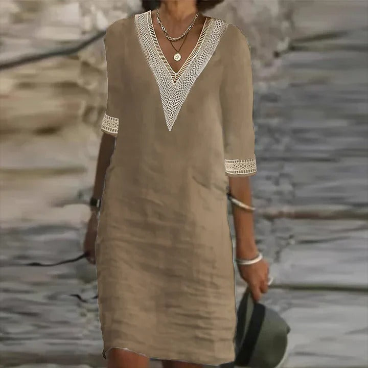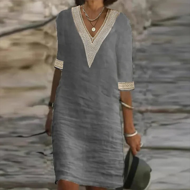 This summer dress is designed with a simple silhouette suitable for different occasions. The short sleeves and relaxed fit allow for comfortable wear during warmer weather. It can be worn for casual outings, social gatherings, or more formal settings depending on how it is styled.